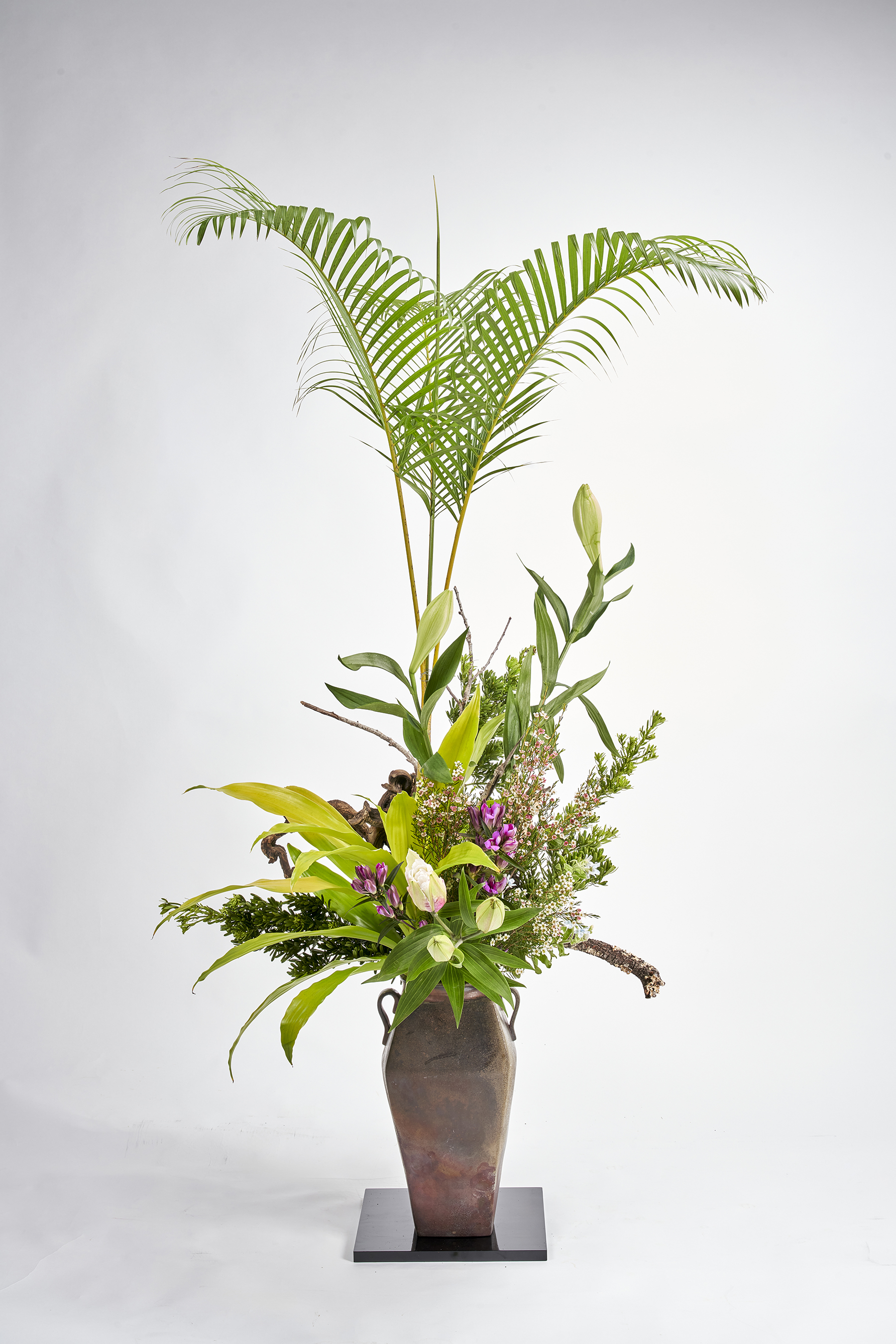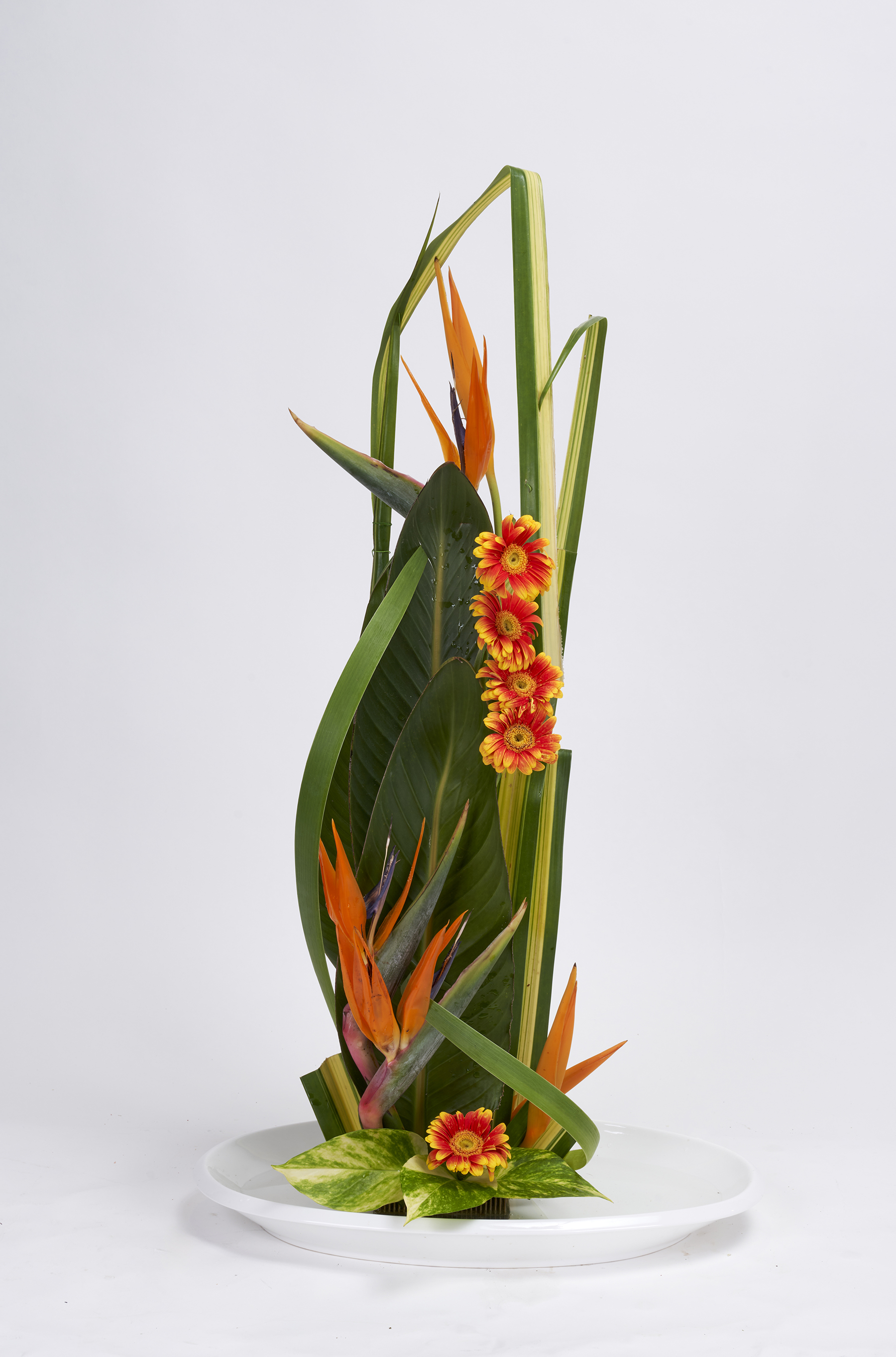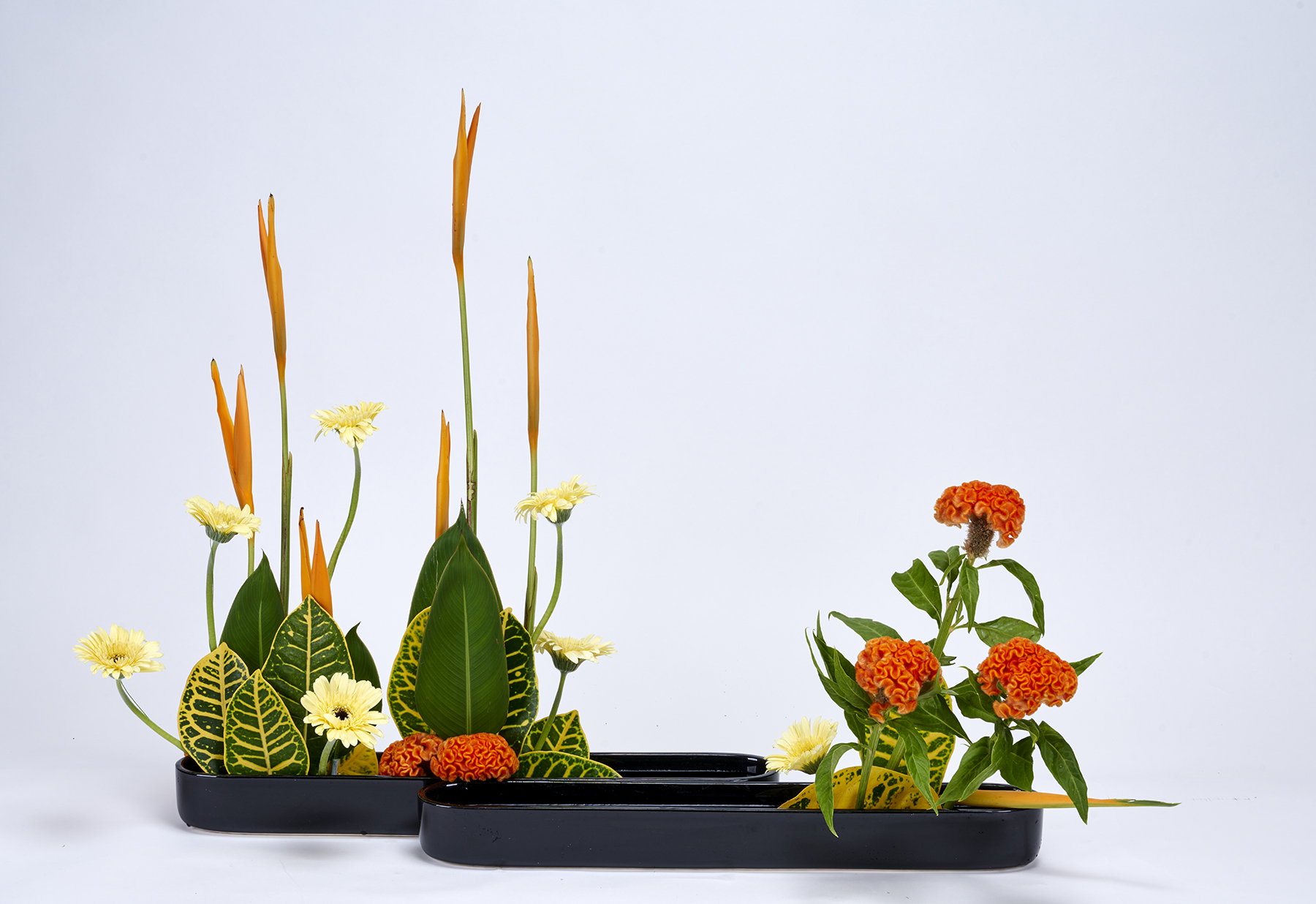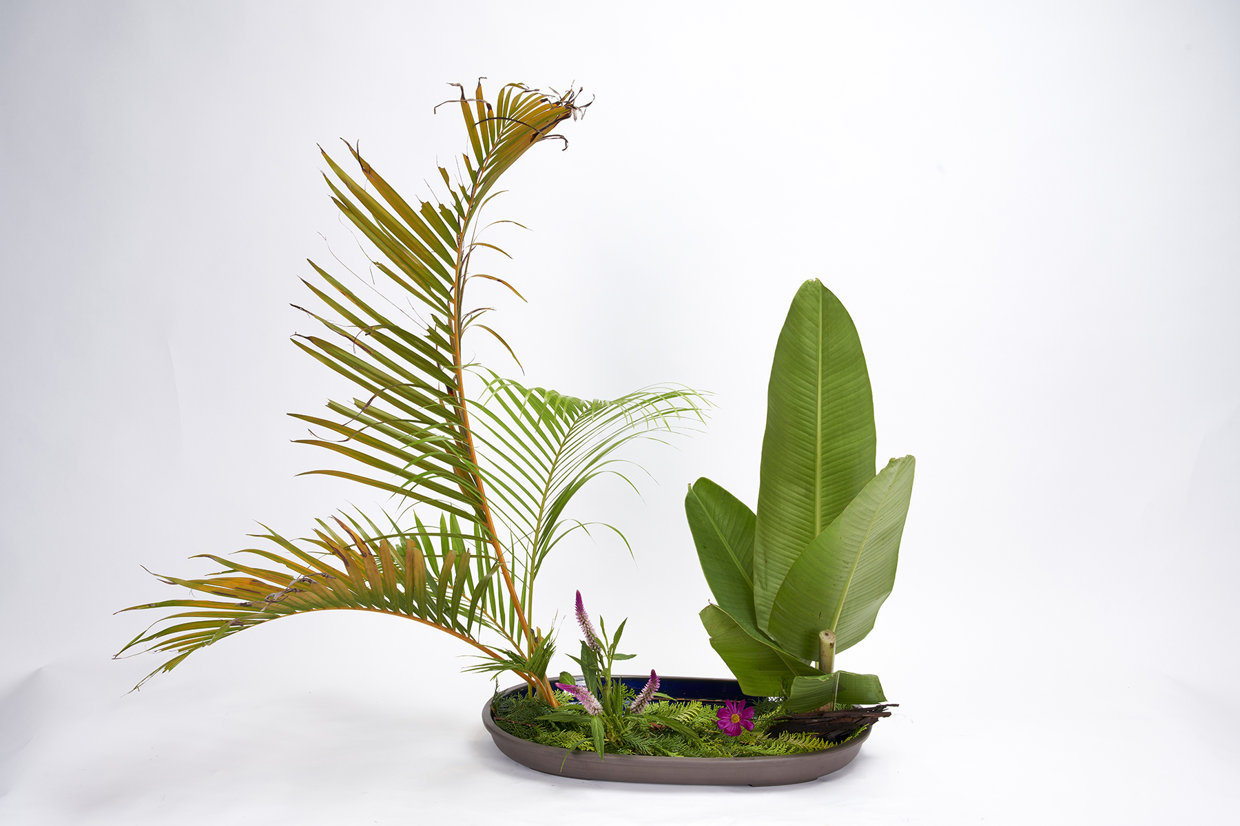 芭蕉蘭葉、椰子葉、黃金側柏、波斯菊、蛇木、劍尾雞冠