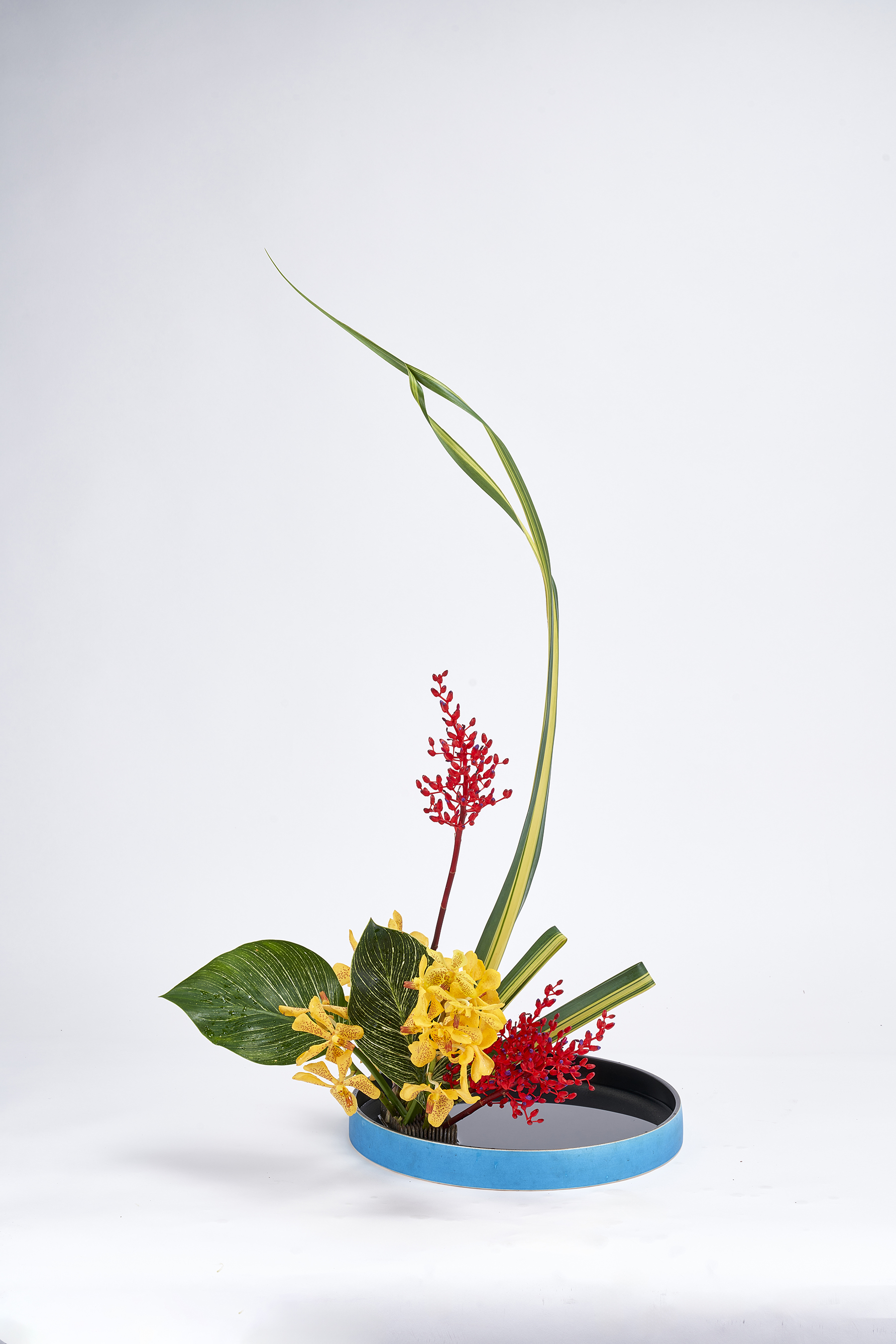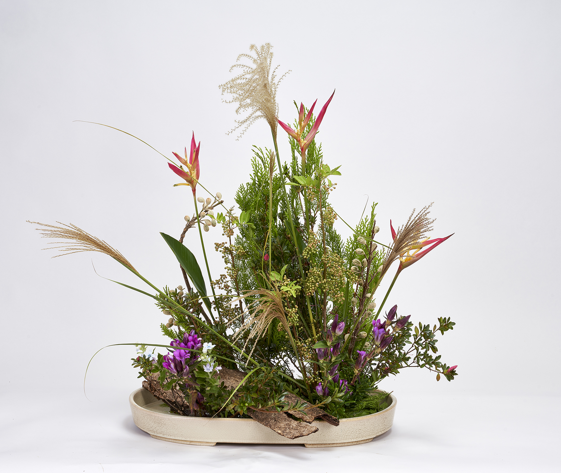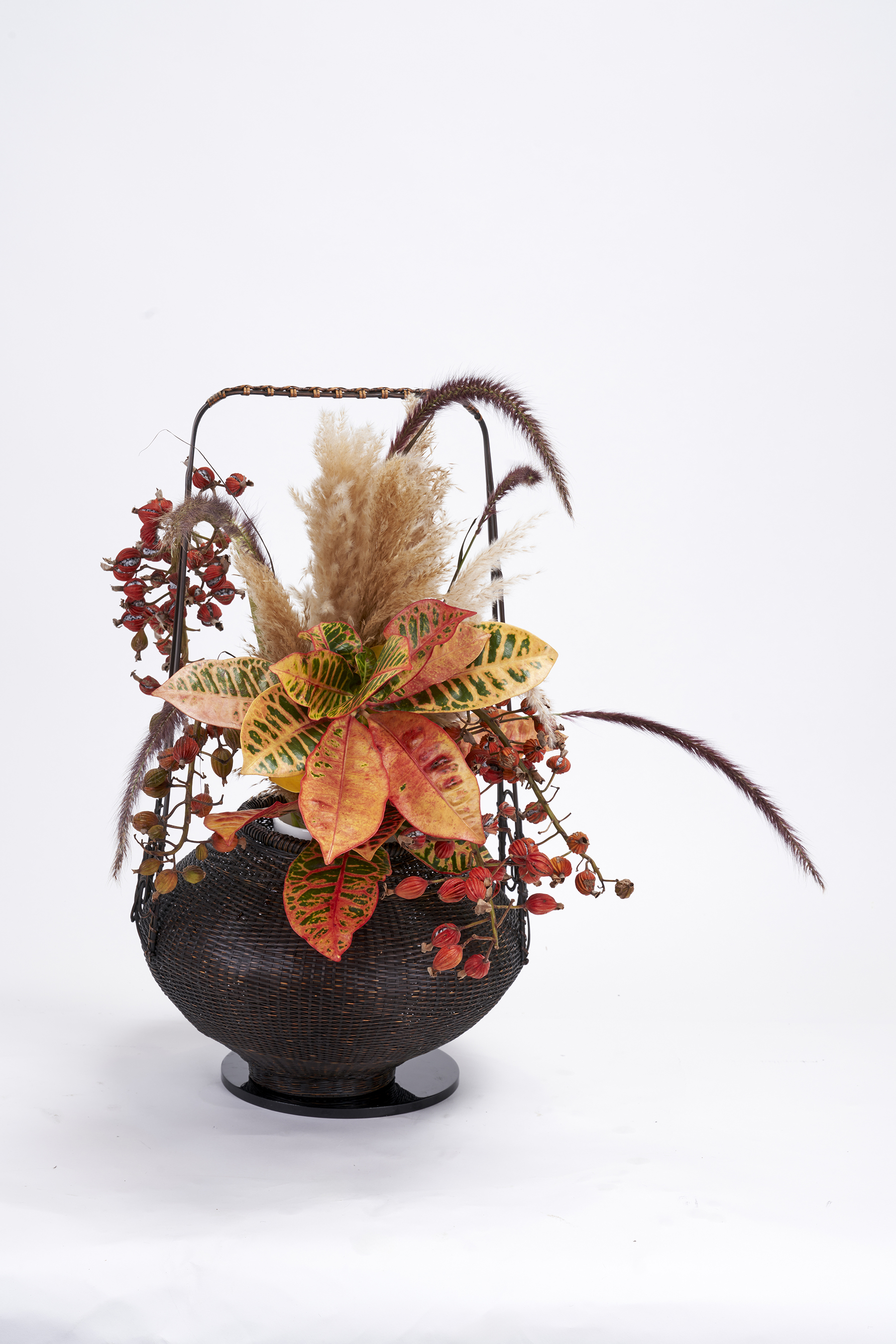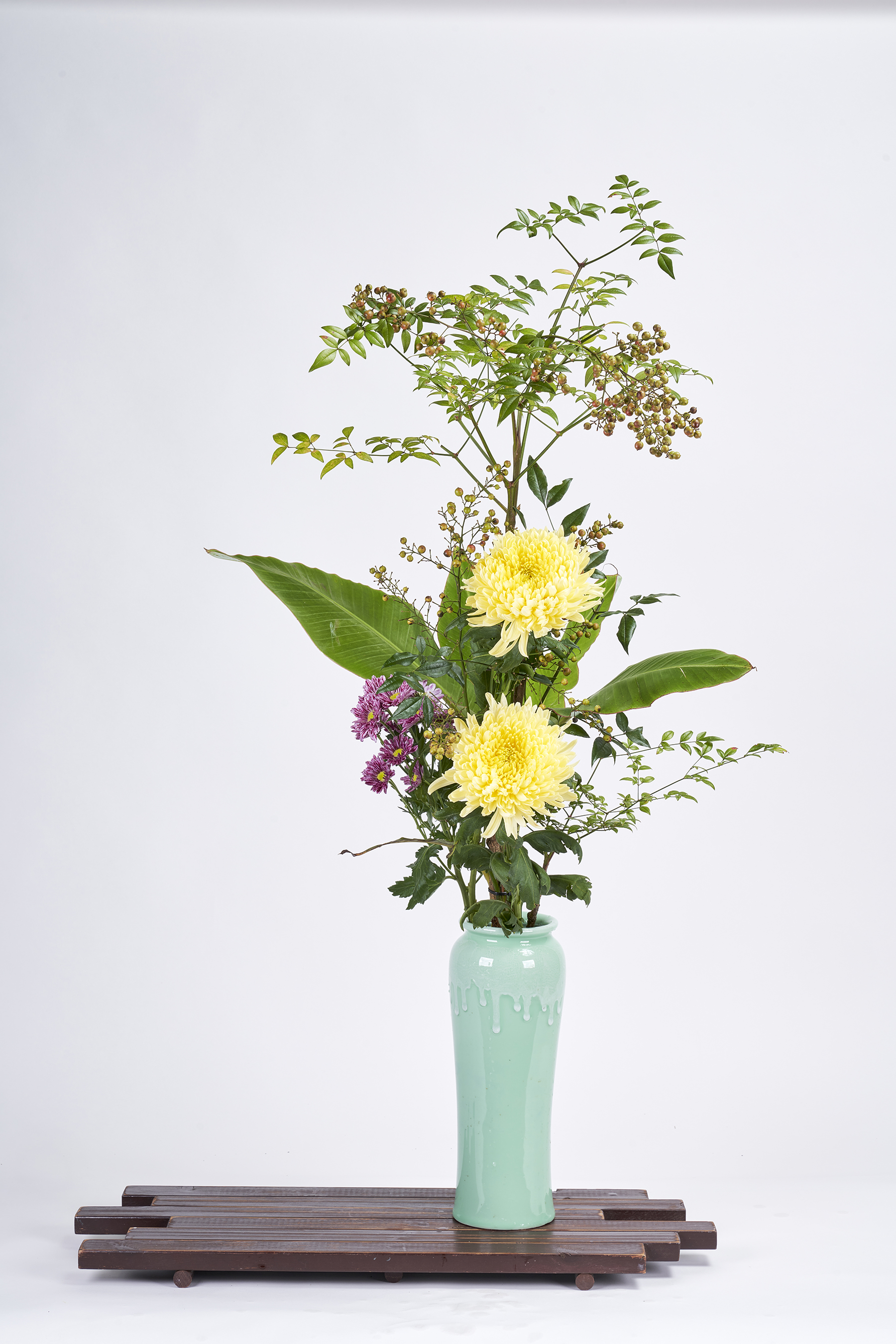 芭蕉蘭葉、椰子葉、黃金側柏、波斯菊、蛇木、劍尾雞冠