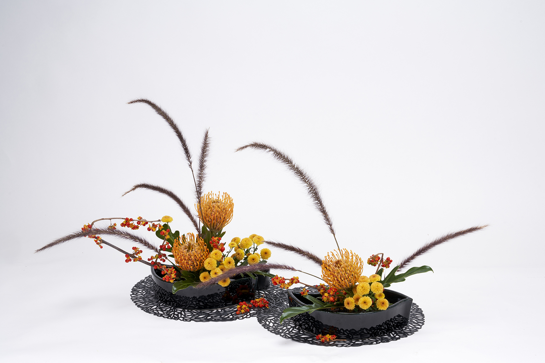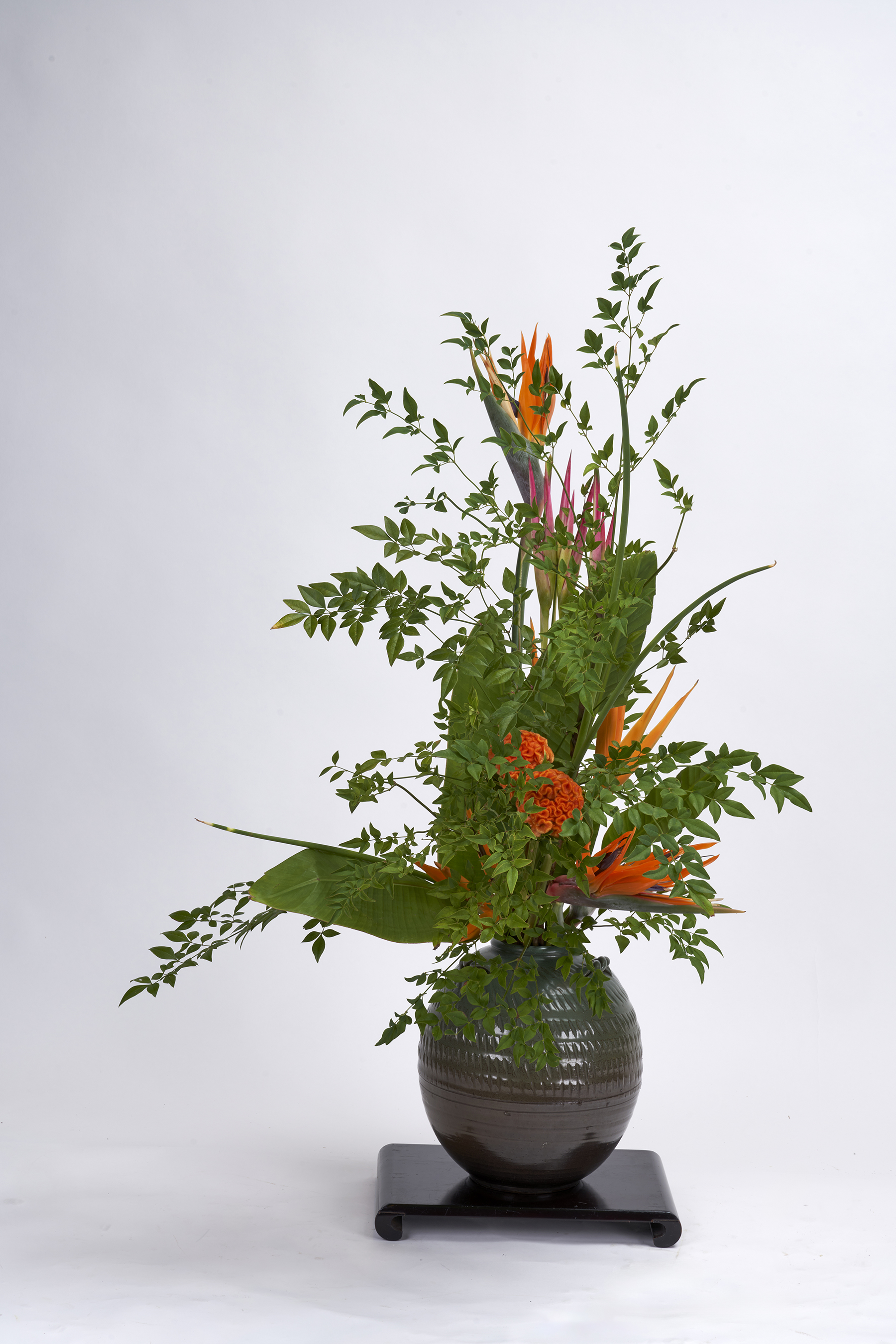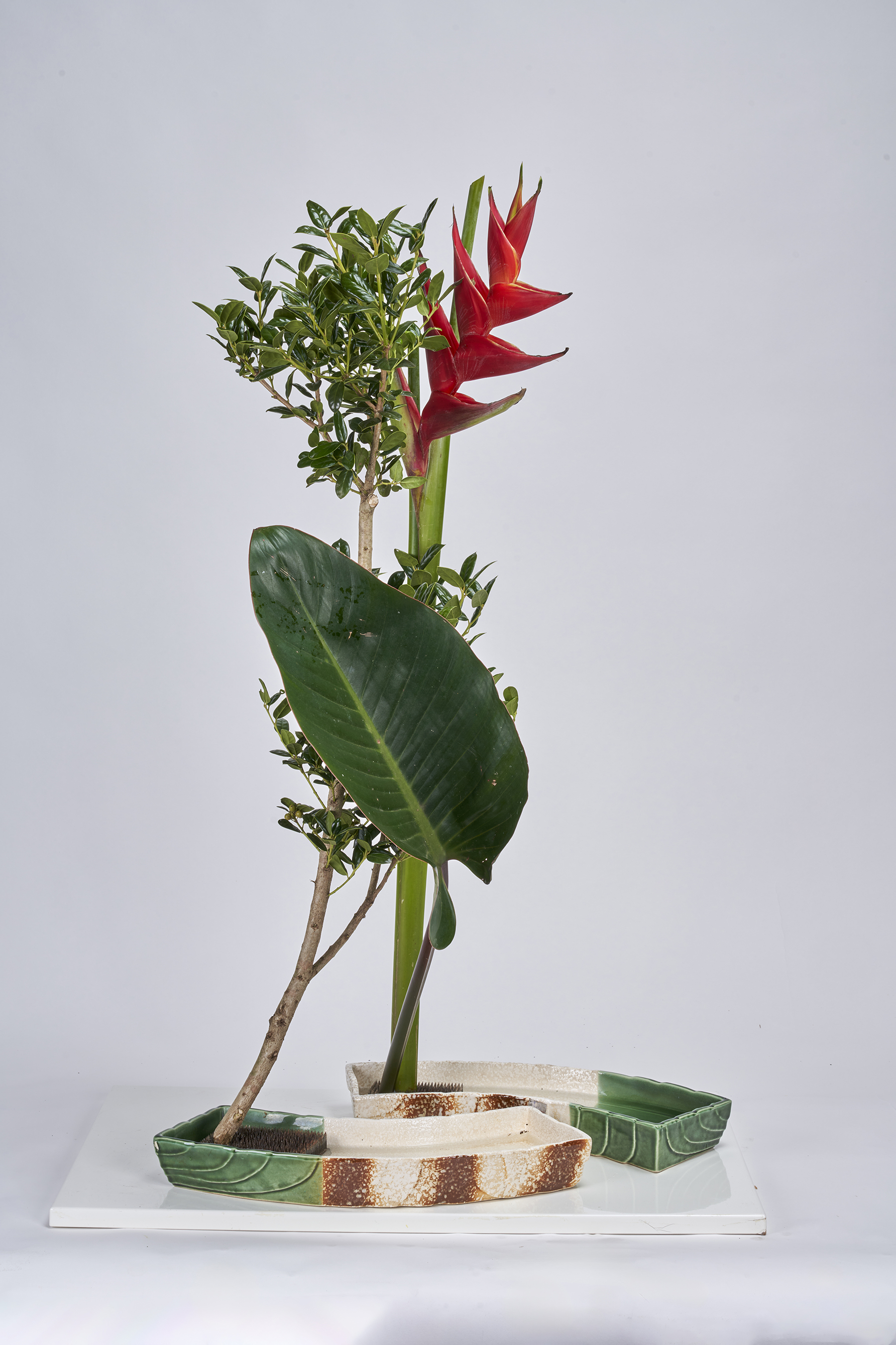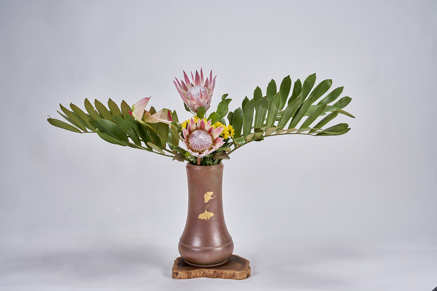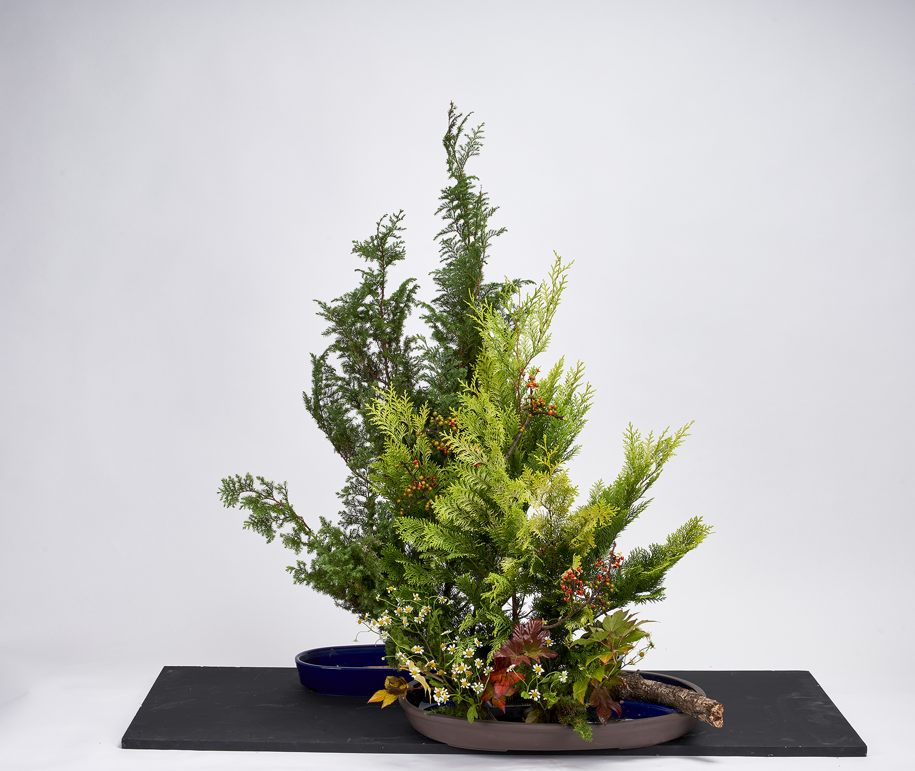 芭蕉蘭葉、椰子葉、黃金側柏、波斯菊、蛇木、劍尾雞冠