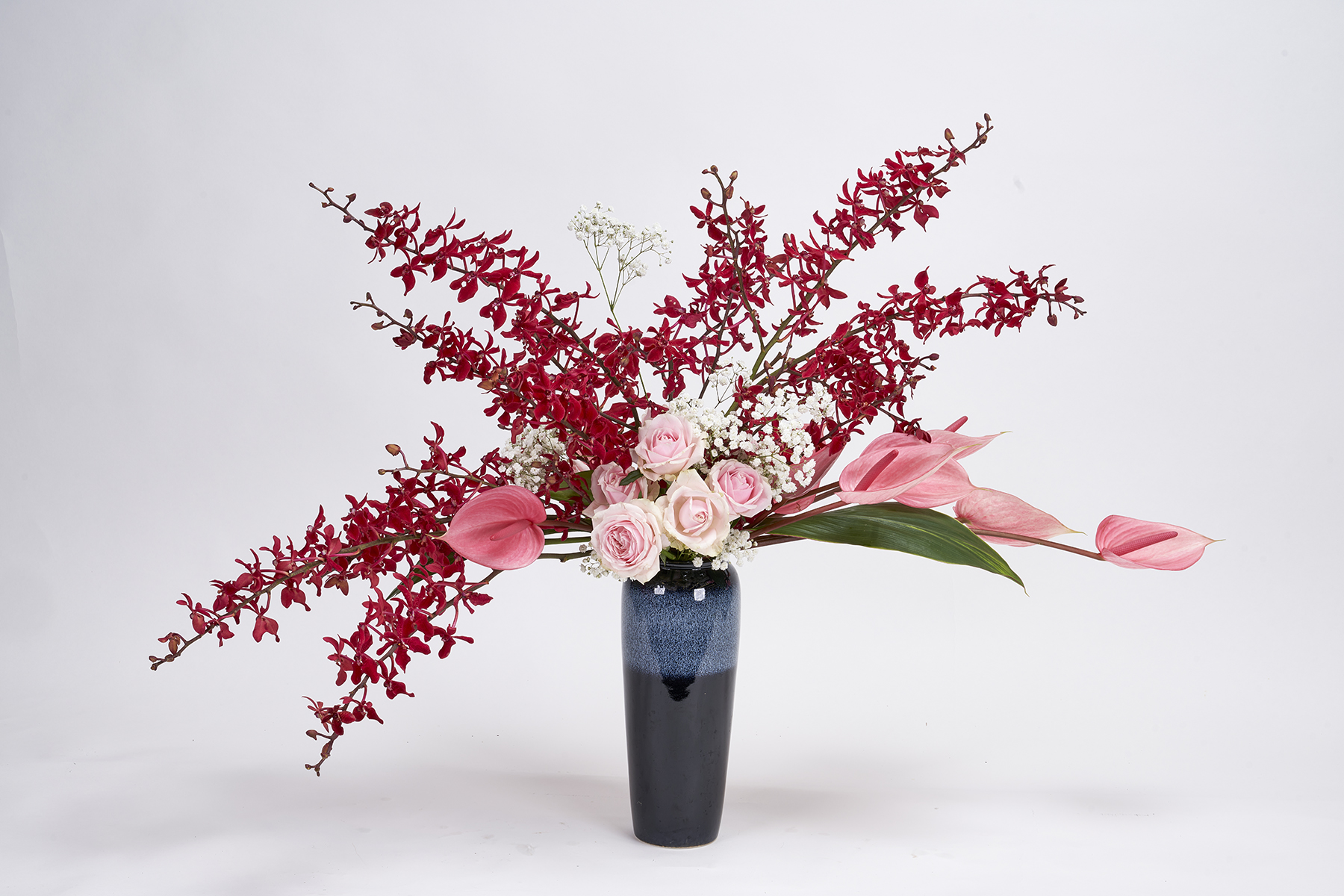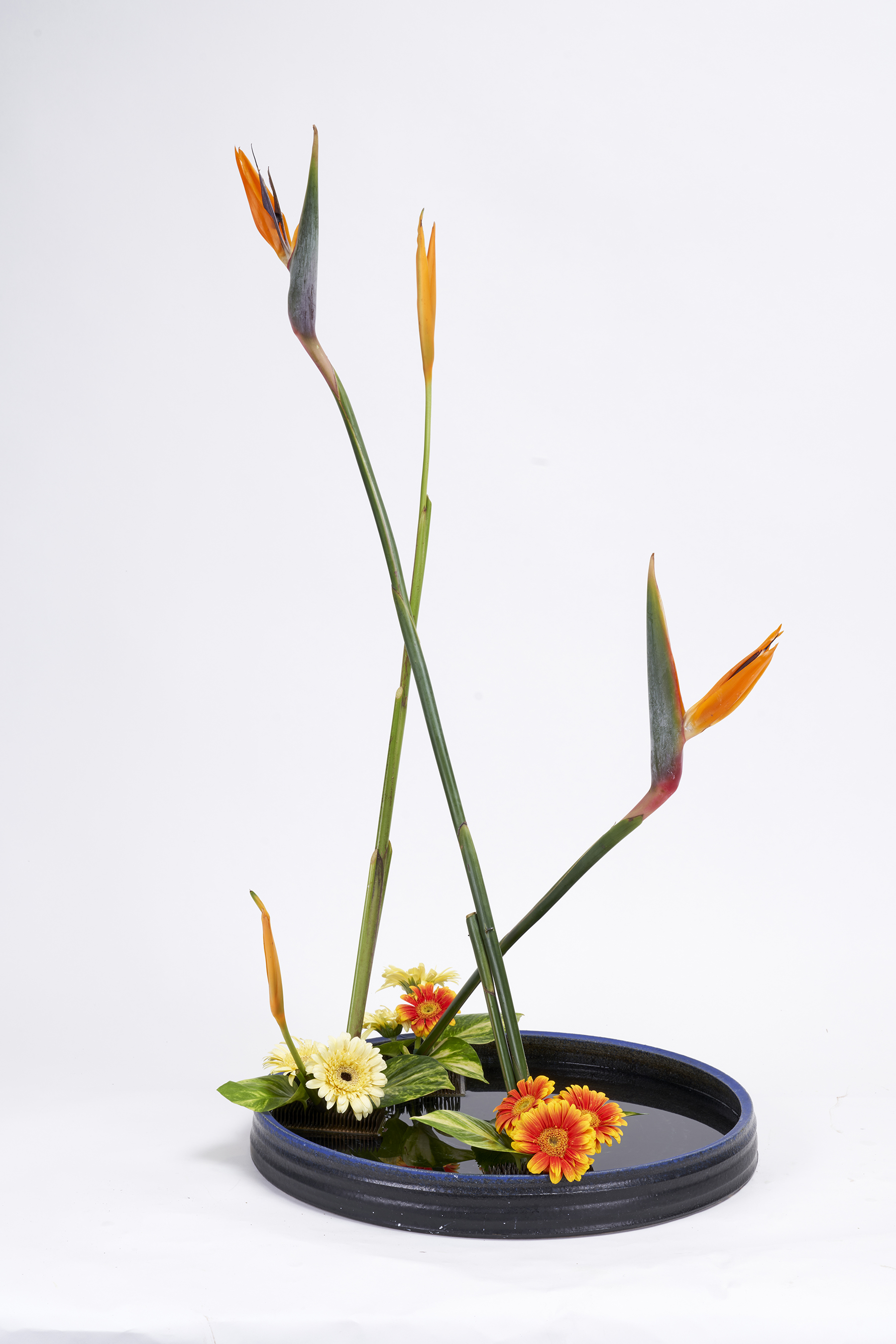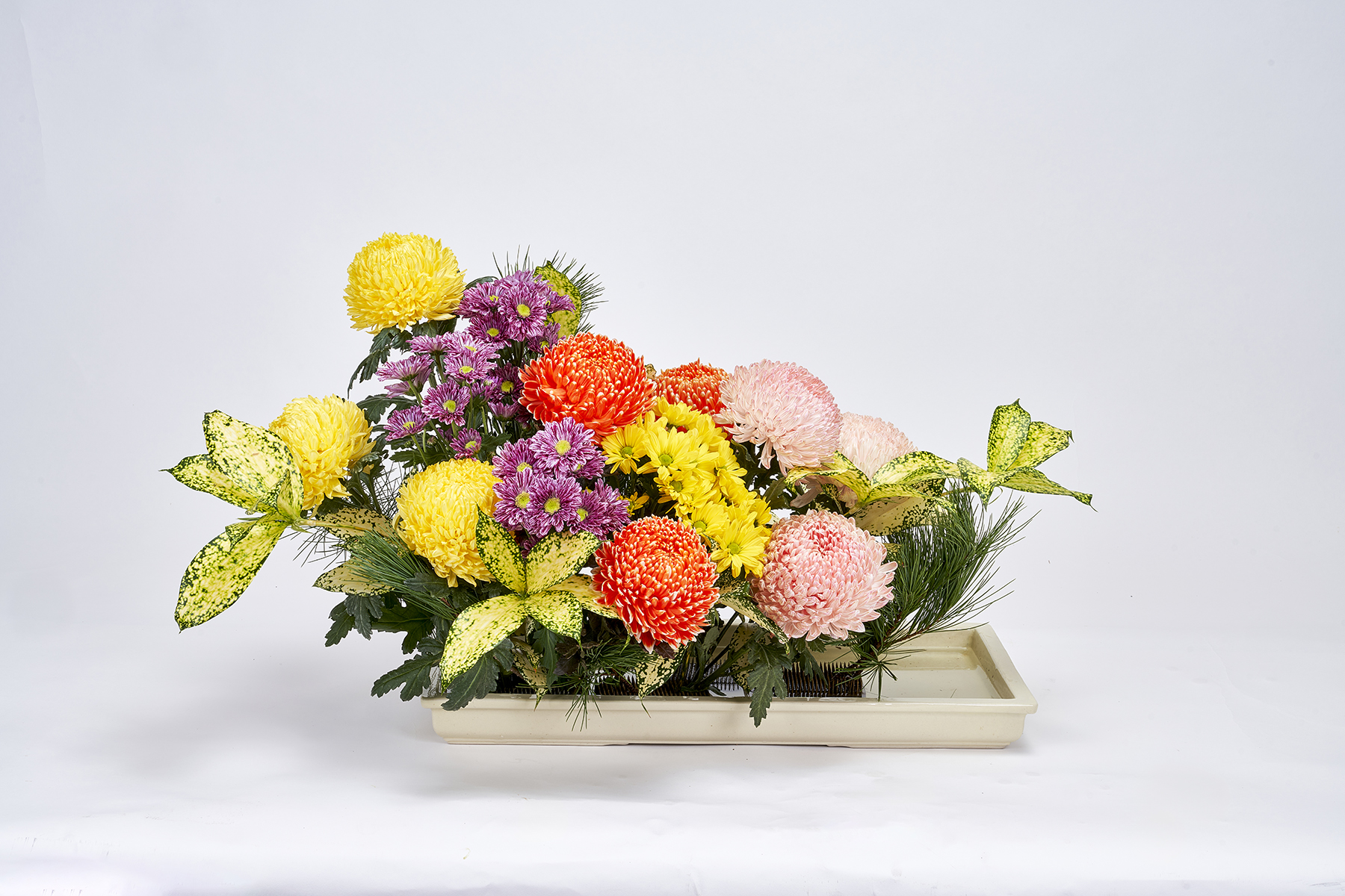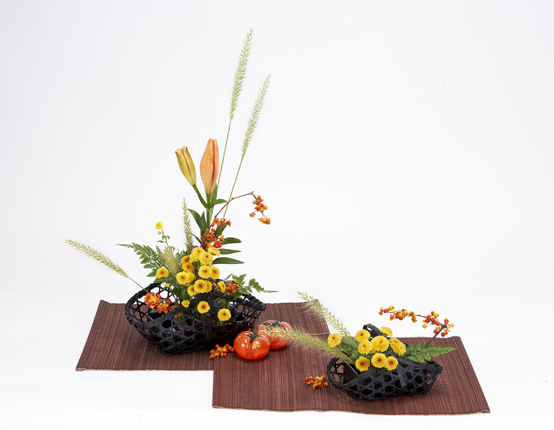 芭蕉蘭葉、椰子葉、黃金側柏、波斯菊、蛇木、劍尾雞冠