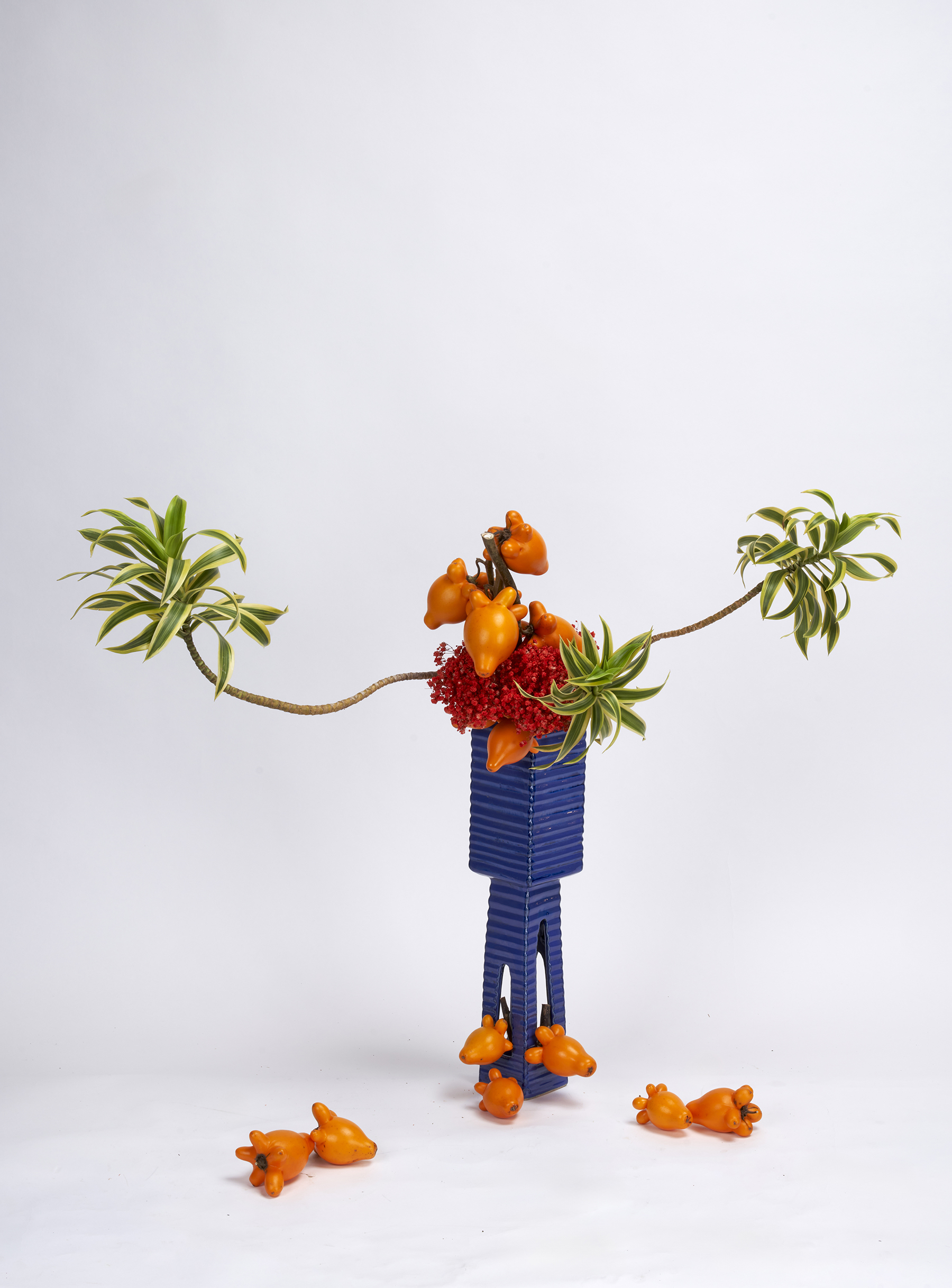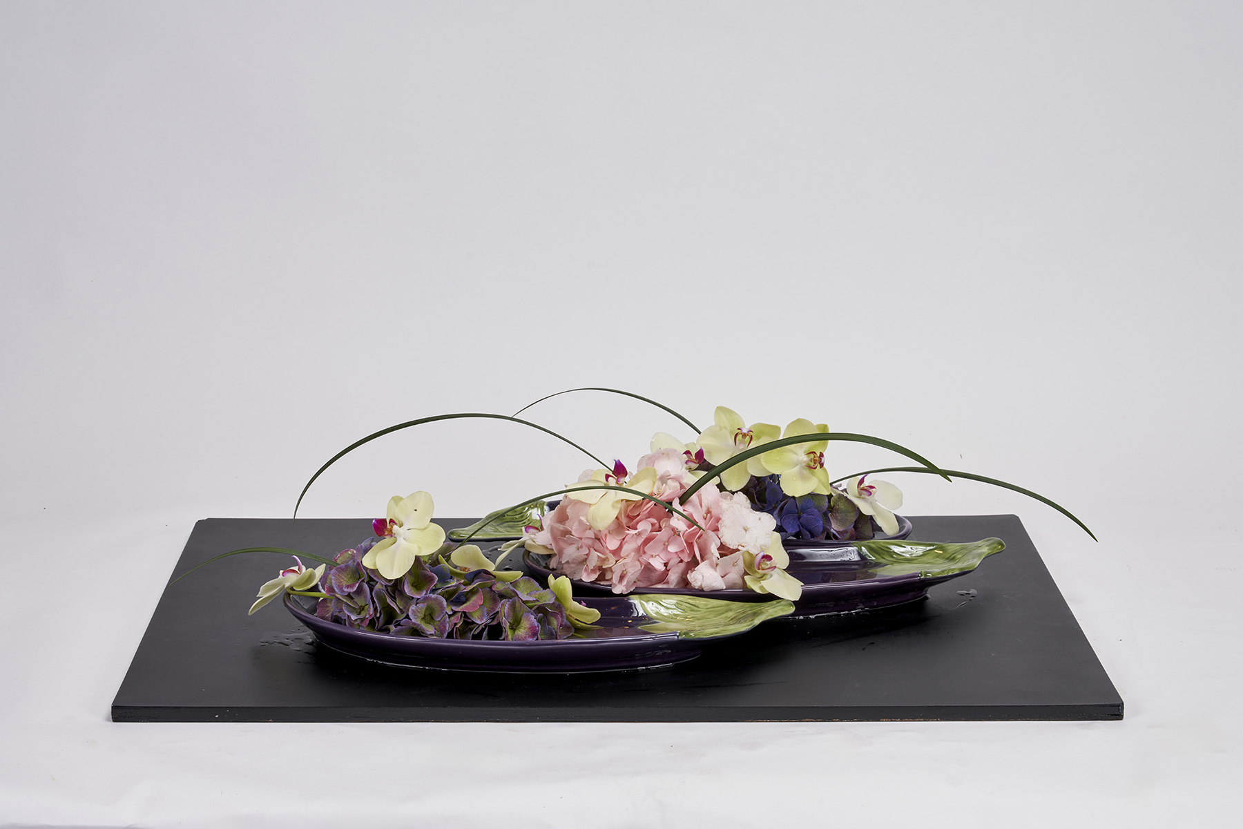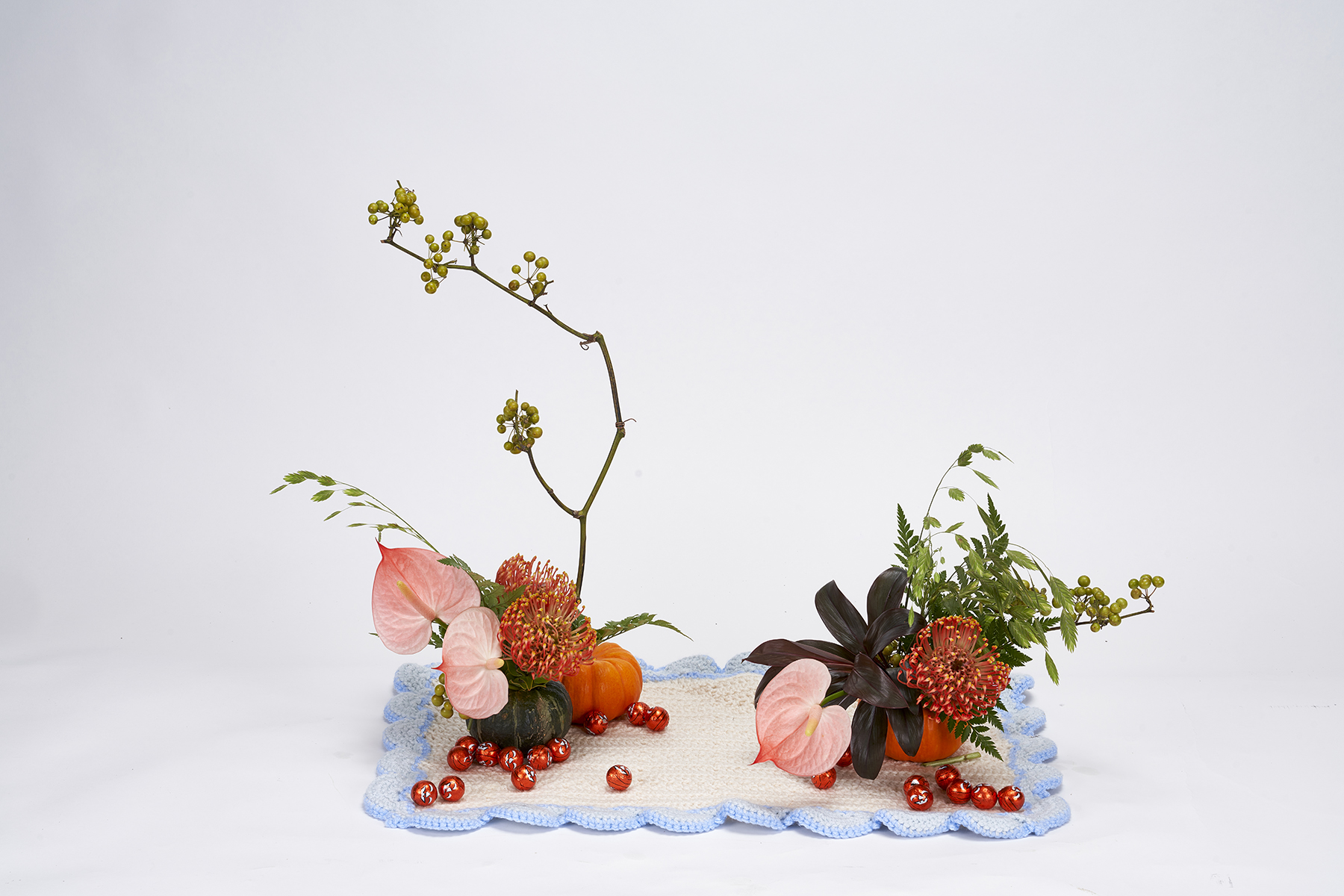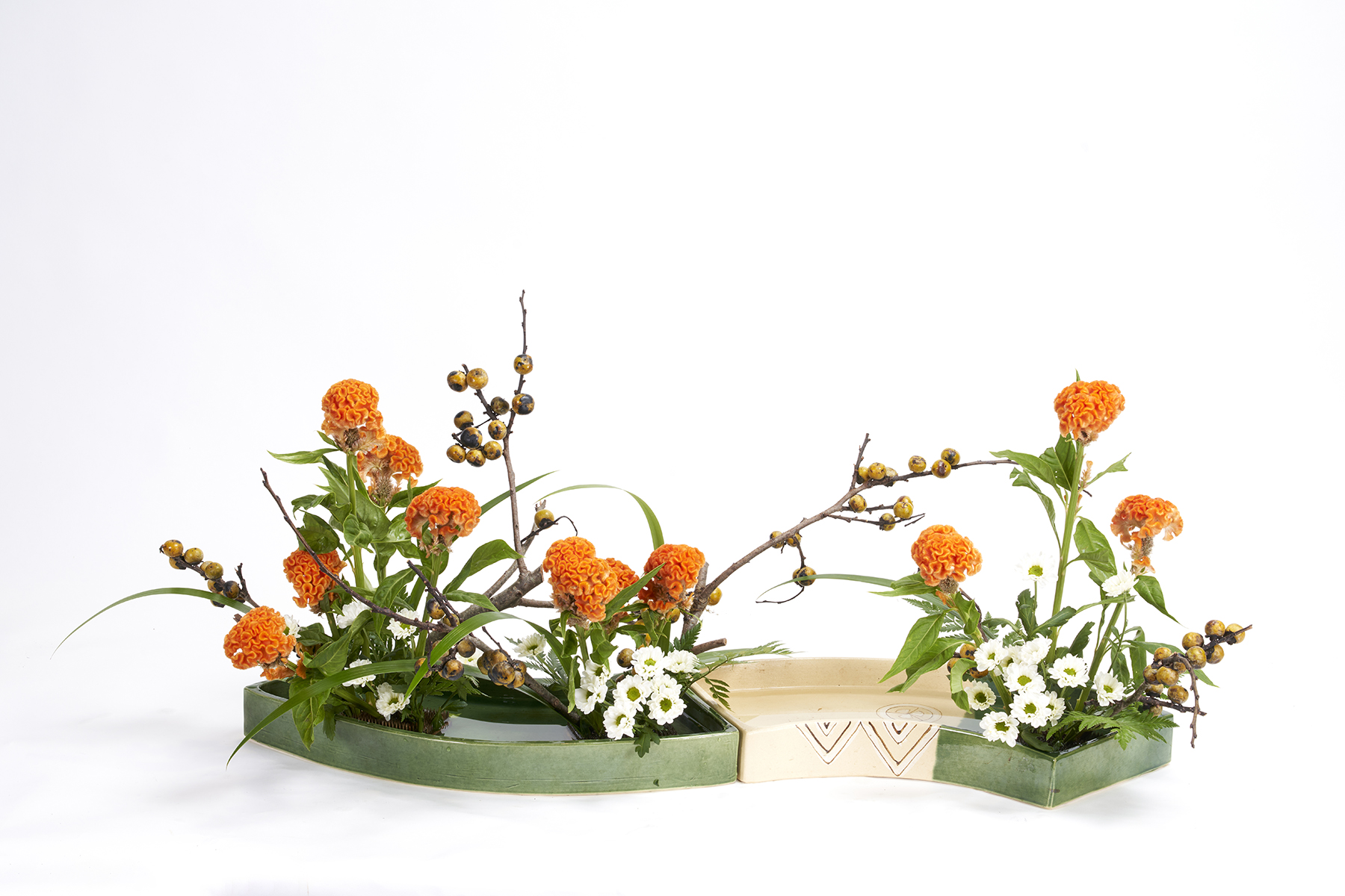 芭蕉蘭葉、椰子葉、黃金側柏、波斯菊、蛇木、劍尾雞冠