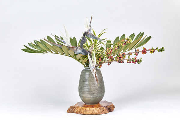 芭蕉蘭葉、椰子葉、黃金側柏、波斯菊、蛇木、劍尾雞冠