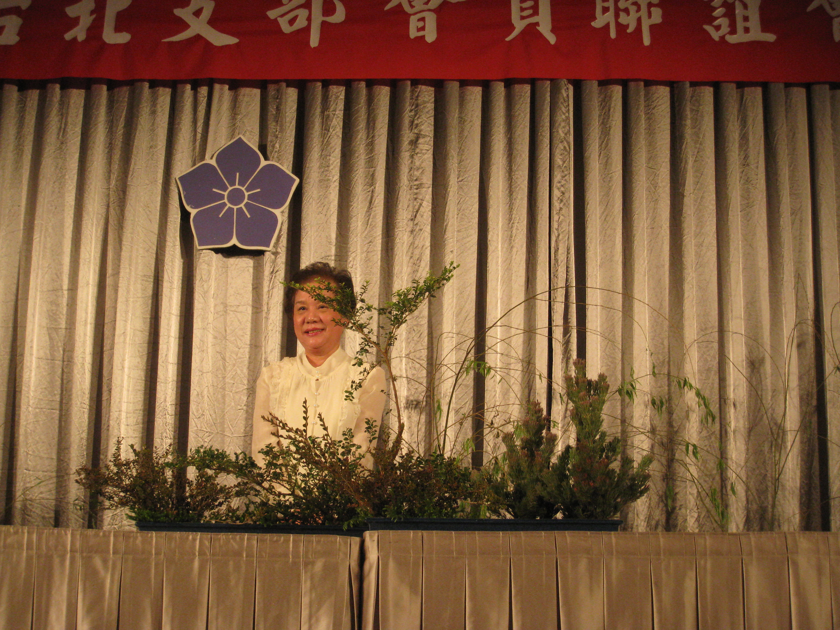春雨暫歇,誠如所盼,今天是個宜人的天氣。 依照往例,所有幹事老師和參展的會員們都在九點左右就在會場開始忙碌了起來,雖然是忙進忙出,卻是個個喜形於色,工作人員為插花藝術的推廣與發展盡心盡力的貢獻。參展者為創作而發揮,展示作品件件精彩,這都歸功於參展會員的一股熱抌與用心。 此次會員大會的節目十分豐富,有插花表演也有二胡演奏,支部長簡短致詞之後,節目準時展開,首先登場的是游老師所策劃的插花表演,插花表演分兩個梯次,第一梯次上台的是鄭美雲老師與林大文老師,鄭美雲老師選用羊毛松、台灣黃楊、日本黃楊、日蔭草等作為寫景插花的主要媒材,所插出的景色帶著淡淡的色階差異,顯得幽靜雅致。林大文老師所使用的花材是紅芽芝、燕子花、鴛尾葉、麒麟草、山羊齒,表現的是水邊風光,除了色彩豐富之外,林老師將水邊的靜潔感表現得令人讚嘆。第二梯次上台的是王麗櫻老師、王美珠老師、彭員淑老師,三位老師表現的是色彩插花,王麗櫻老師選用最當季的孤挺花,鳴子百合,王美珠老師採用孤挺花以及粉綠雙色的火鶴花為主要花材,彭員淑老師是用粉綠雙色的火鶴花為主要花材,再配上黃金葛修飾,最後三位老師以紅柳連結,三個作品可以單獨呈現也可以將之連成一個大作,可見策劃老師在構思上的獨具匠心。插花的整個過程都是經由游金足顧問詳加說明,相信對所有會員來說,都像是上了一堂新的插花知識課程。除此之外,為配合黃家俊老師的二胡演奏,游顧問還請了廖月霞、 戴金花、何宜宜三位老師在舞台上以垂柳、松葉文竹、金葉串錢柳、三葉杜鵑插作了一個背景,配合二胡演奏,整個舞台的氣充滿東方情境。 緊接的節目是二胡演奏,首先是黃家俊老師帶領樹林農會二胡班的數位班員一起演出,並且介紹各朝代的二胡,令眾人大開耳目。最後則是黃老師精湛的獨奏以及活潑生動的打擊樂表演,獨奏讓大家聽得如醉如癡,打擊樂令大家滿心喜悅、興奮歡愉。快樂,應該可說是與會所有會友們今天的句點。